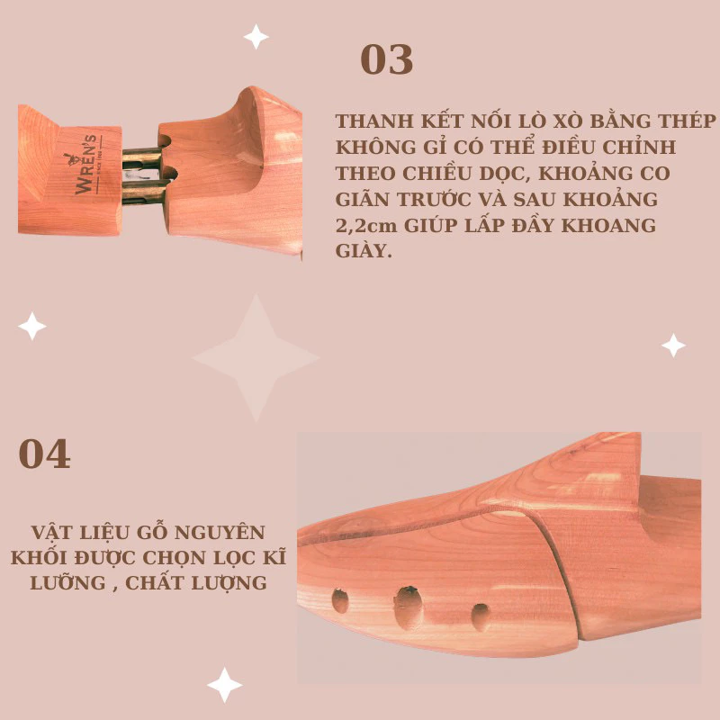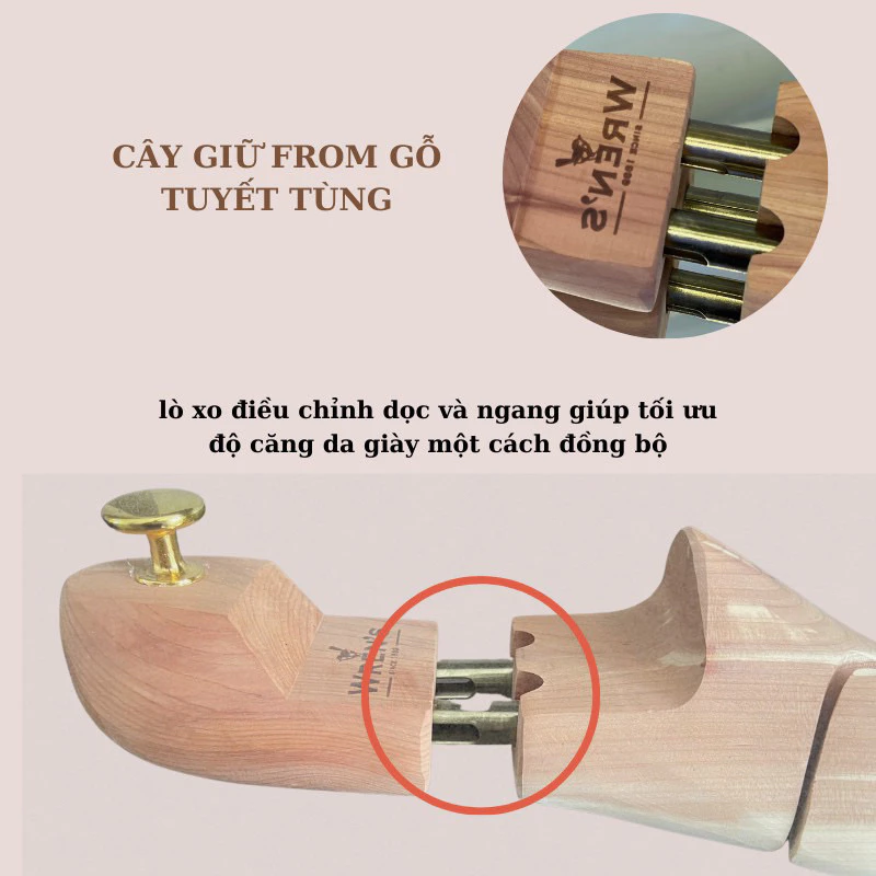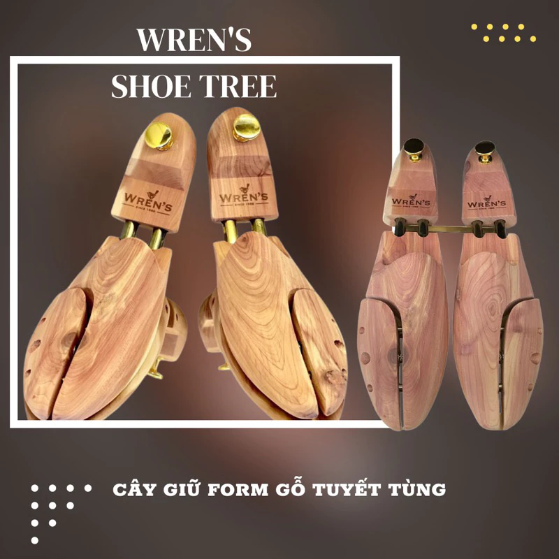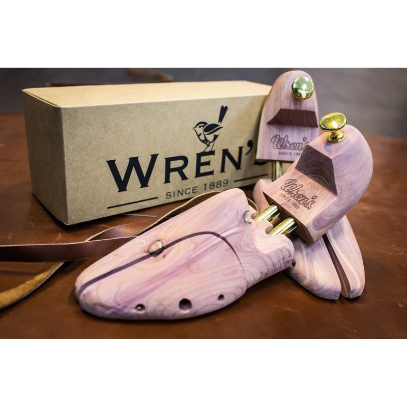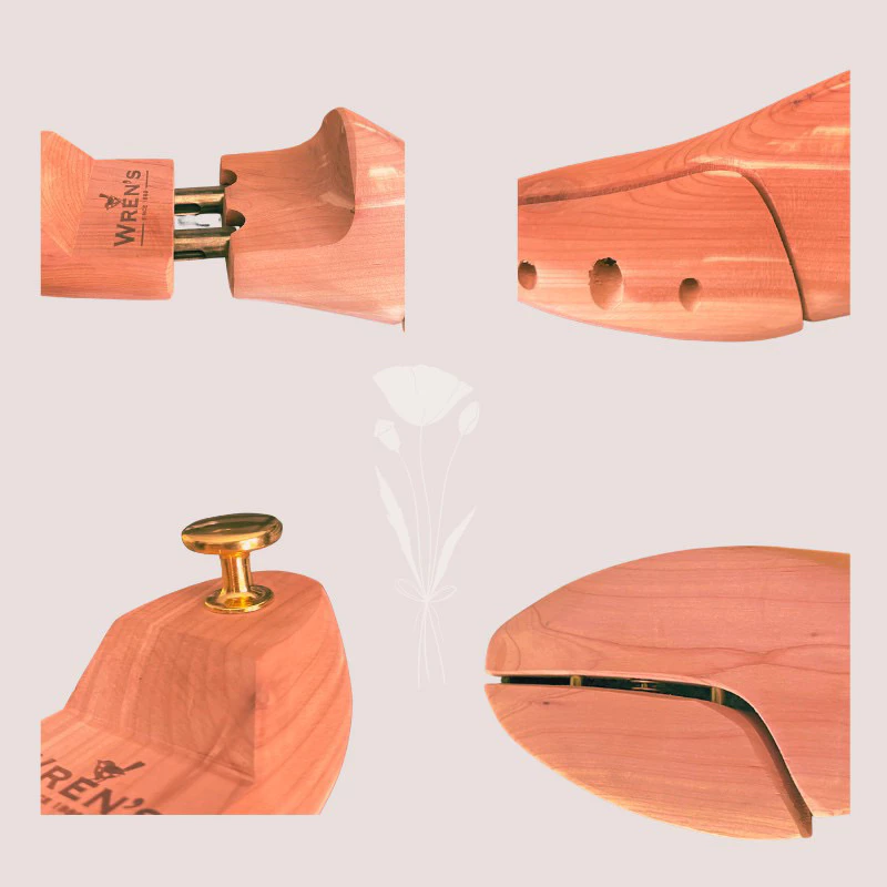 Được chế tác từ gỗ tuyết tùng(cedar) đỏ tự nhiên nguyên khối, đôi cốt giày này rất cần thiết để giúp duy trì kiểu dáng ban đầu cho đôi giày da của bạn và ngăn ngừa hình thành các nếp nhăn khó coi. Kiểu dáng của Wren's shoetree được thiết kế để phù hợp với hầu hết các loại giày da, kể cả giày giày thể thao, đặc biệt là nhờ có đường xẻ hai bên. Wren's shoetree có các núm bằng đồng thanh lịch, dễ dàng sử dụng. Gỗ tuyết tùng tự nhiên tỏa ra mùi hương tươi mát và tự nhiên, đồng thời hấp thụ độ ẩm từ da.