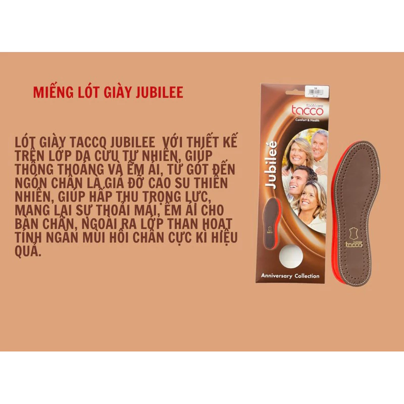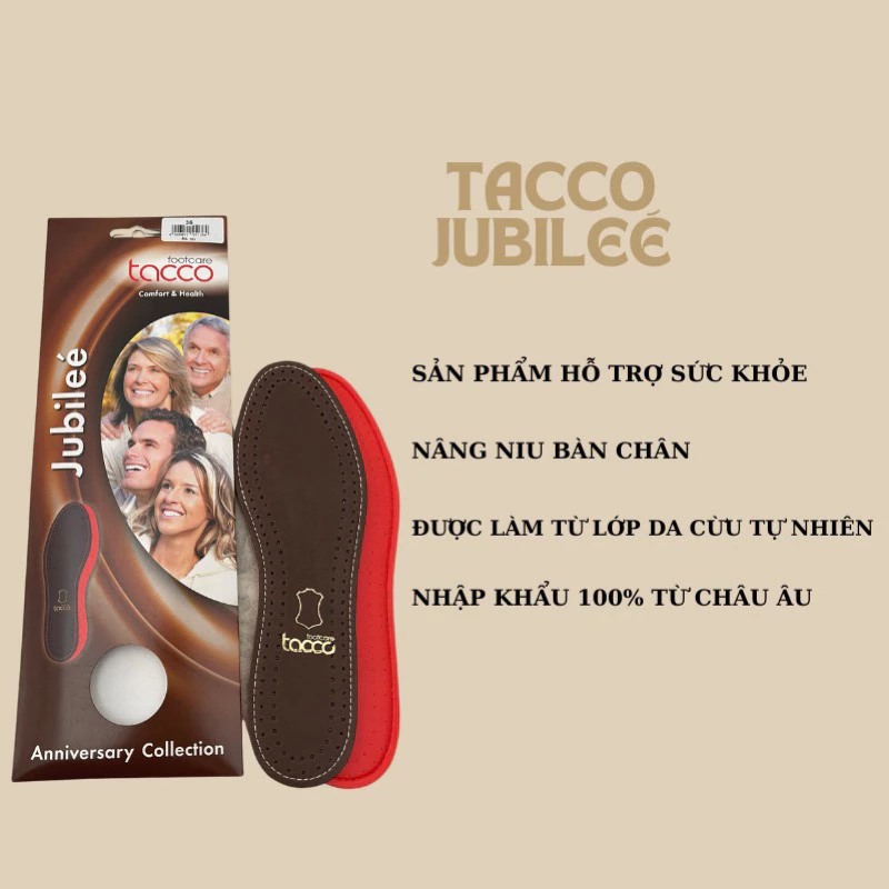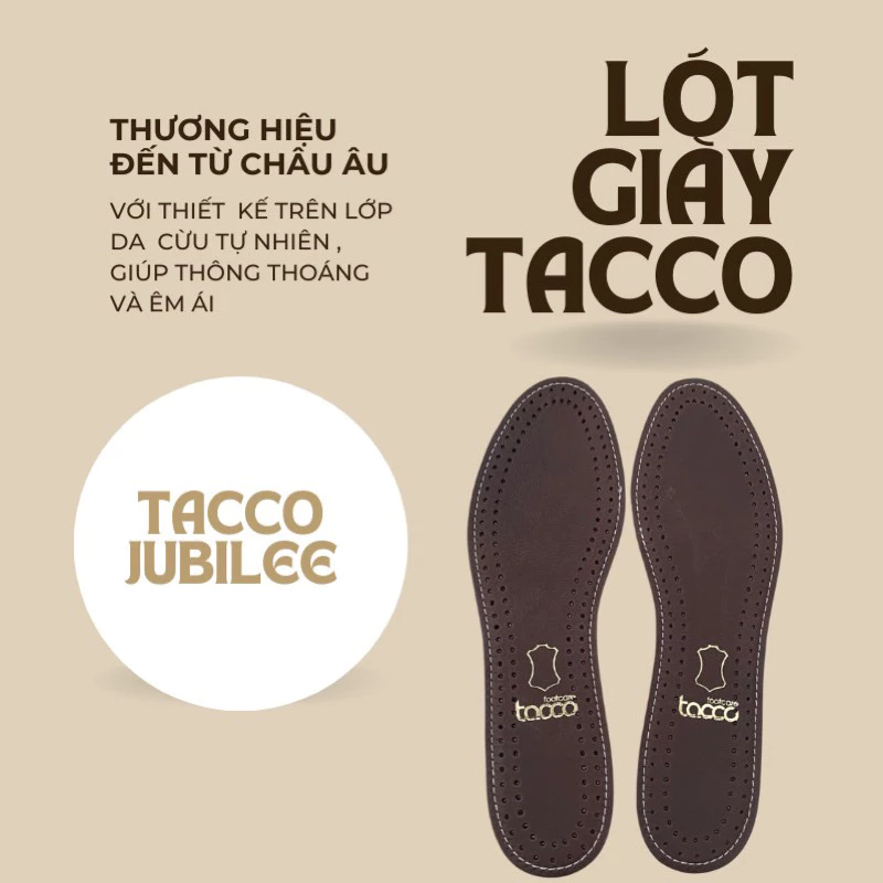 - Cặp lót giày TACCO JUBILEE giúp thông thoáng và êm ái, từ gót đến ngón chân là giá đỡ cao su thiên nhiên, giúp hấp thụ trọng lực mang lại sự thoải mái và dễ chịu cho bàn chân Đây là phụ kiện giúp bàn chân luôn được thoải mái, dễ chịu khi phải đi lại nhiều.